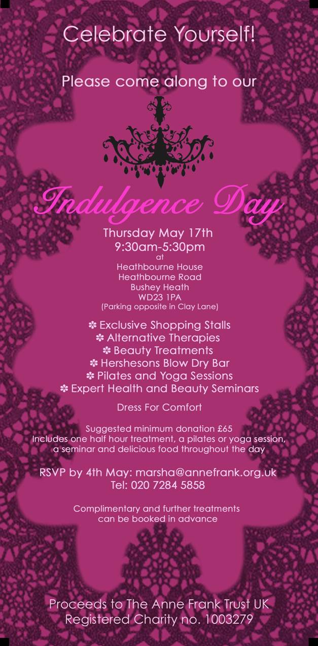 The Anne Frank Trust are a wonderful UK charity that take workshops into schools to teach positive attitudes, respect for others and encourage young people to challenge prejudice and hatred. Last year they organised the most wonderful fundraising Ladies Day Out , and for the second one on May 17th I am taking part with a whole load of other first rate therapists . Whether you can make the whole day or just 2 or 3 hours, do come along as its going to be spectacular !!!